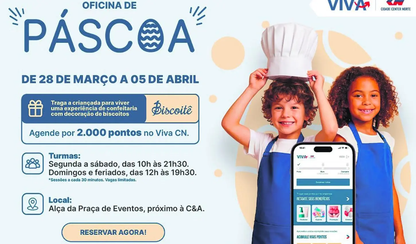 Até 5 de abril, o Shopping Center Norte, que é referência na Zona Norte de São Paulo e faz parte da Cidade Center Norte, apresenta a Oficina de Páscoa em parceria com a Biscoitê. Esta ação, promovida através do Viva Center Norte, programa de benefícios da Cidade Center Norte, convida crianças de até 10 anos para participarem de uma experiência inovadora que combina confeitaria e personalização de biscoitos. O acesso é realizado através do resgate de pontos no aplicativo, proporcionando um momento lúdico e interativo, tornando a ida ao shopping e as compras de Páscoa uma experiência completa para toda a família.